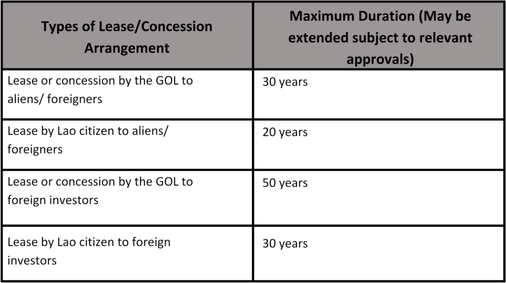 A: Foreign individuals and foreign-invested companies, including joint-ventures, cannot own land in Laos. They are restricted to: (i) leasing land from Lao citizens or the GOL, or (ii) receiving land concessions from the GOL. Below are types of lease/concession arrangement and their maximum duration of lease.